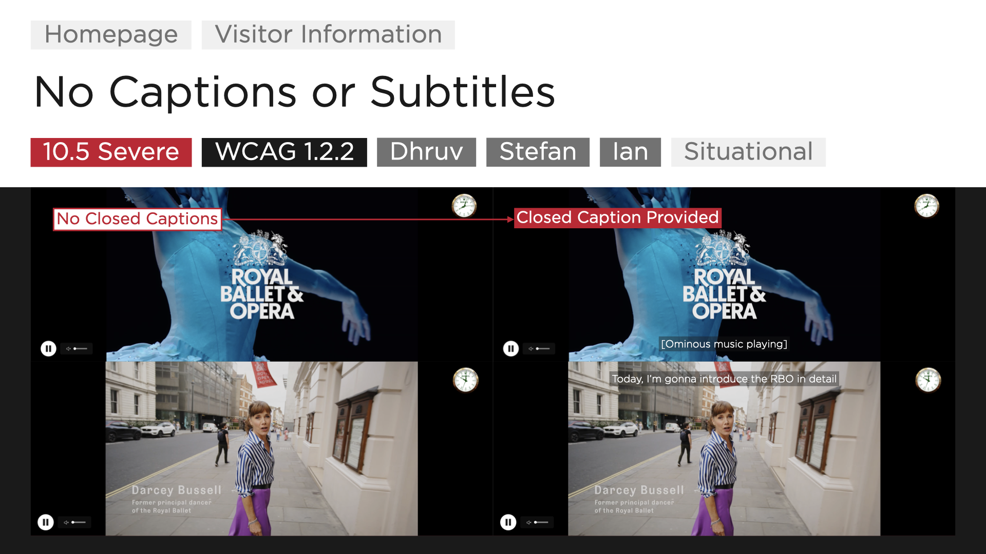 Hero-section videos lacking subtitles, excluding users with hearing impairments or situational constraints.