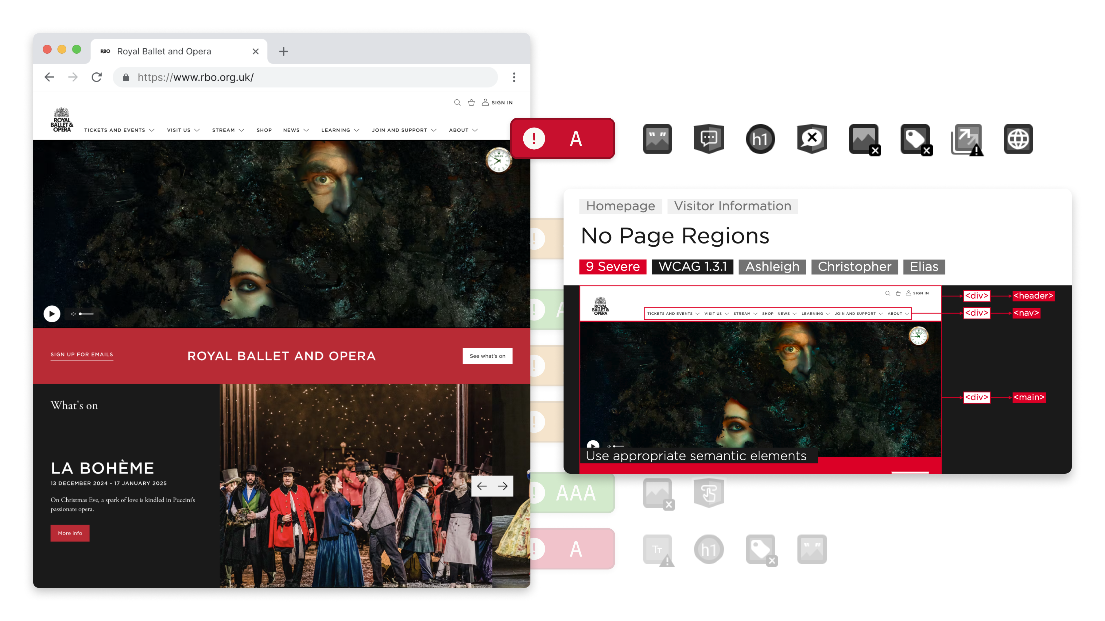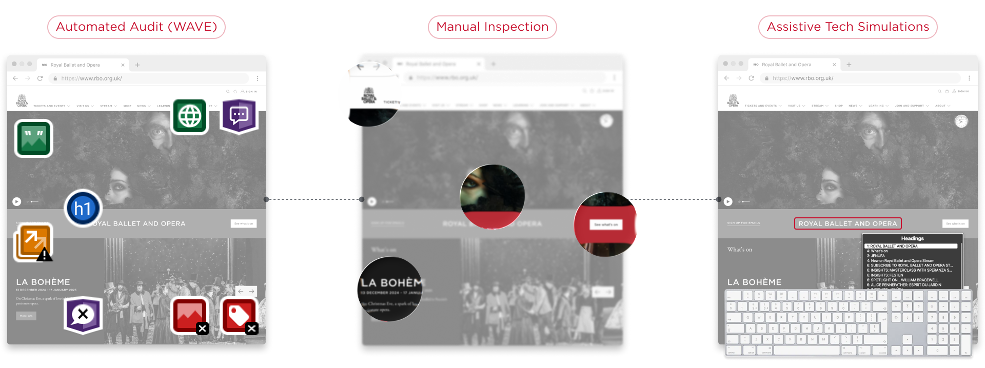 • To ensure the audit’s validity, the research began by analysing RBO’s actual accessible event types (e.g., Relaxed, BSL, Audio Described performances). Based on this operational context, six personas representing real audience segments were selected from GOV.UK and W3C standards.