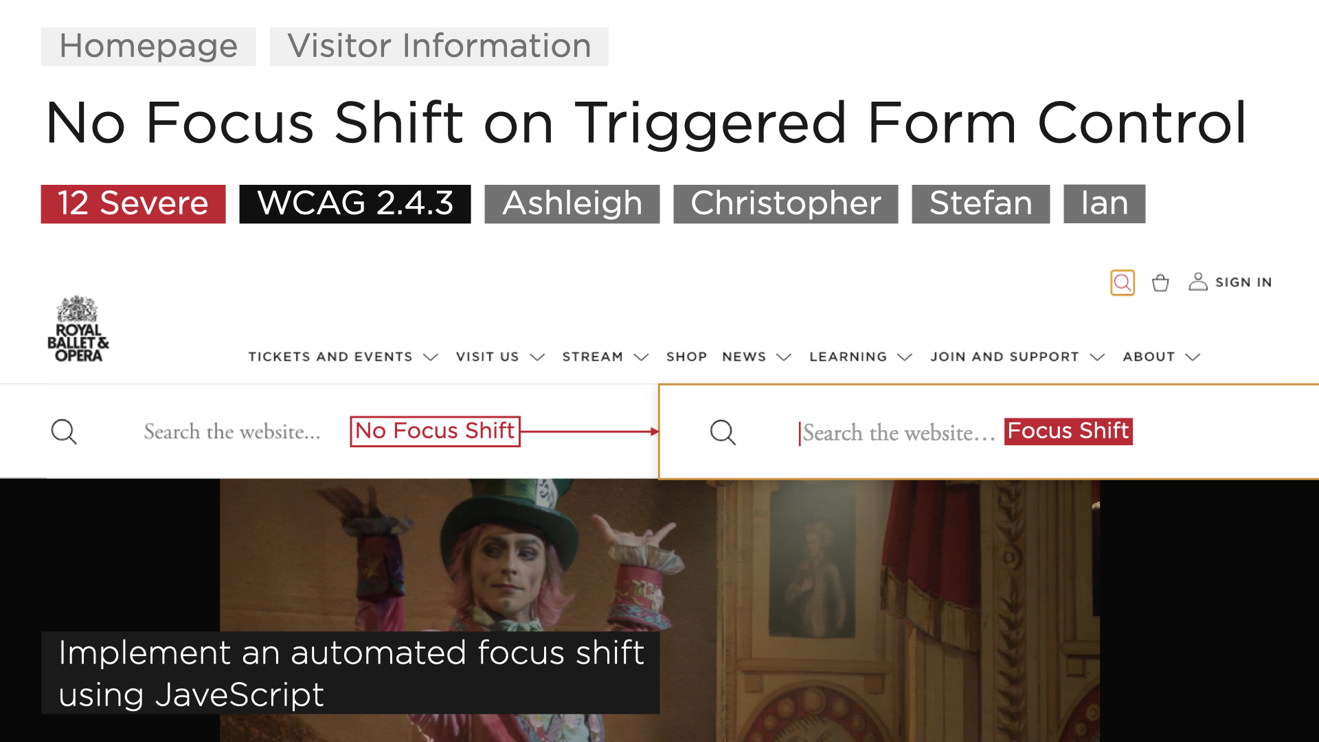 Lack of automatic focus movement when triggering the search input, creating a critical blocker for keyboard users.